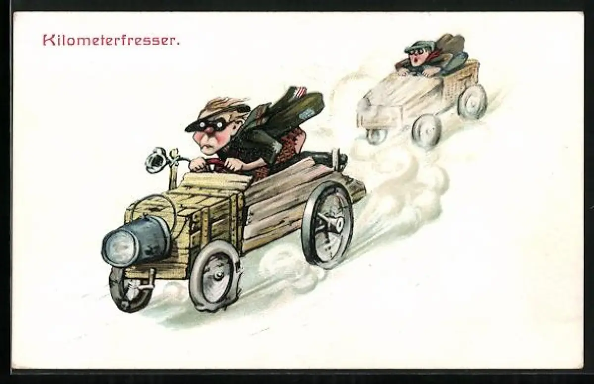 AK Zwei junge Männer rasen mit selbstgebauten Autos durch die Gegend
