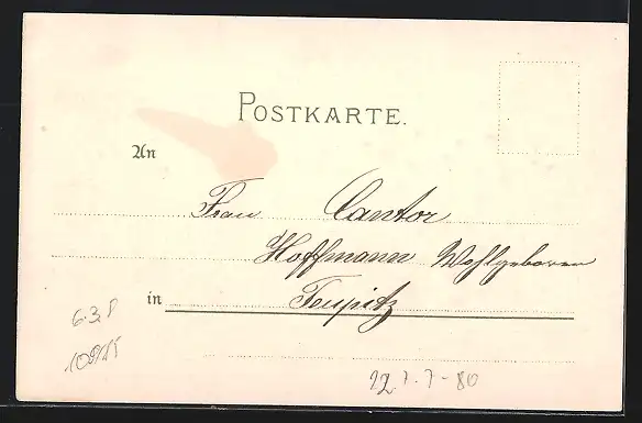 Personenbezogene Daten auf der Rückseite der Karte wurden durch blauen Textmarker unkenntlich gemacht. Die blauen Stellen sind auf die Vorderseite durchgeweicht und wirken sich negativ auf das Postkartenfoto aus