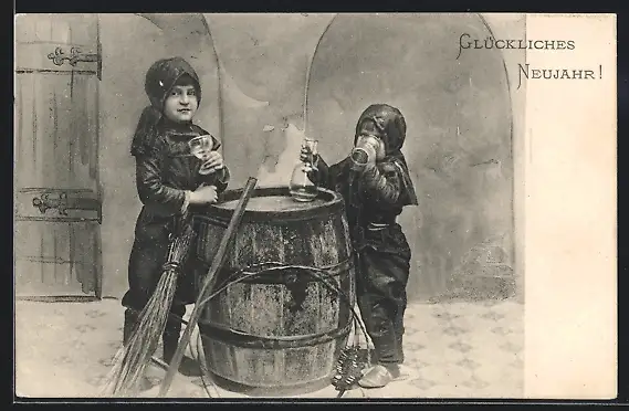 AK Zwei kleine Schornsteinfeger am Weinfass, Glückliches Neujahr