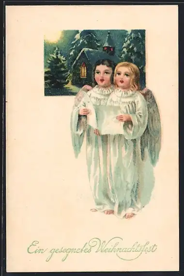 AK Zwei singende Weihnachtsengel vor nächtlicher Kirche