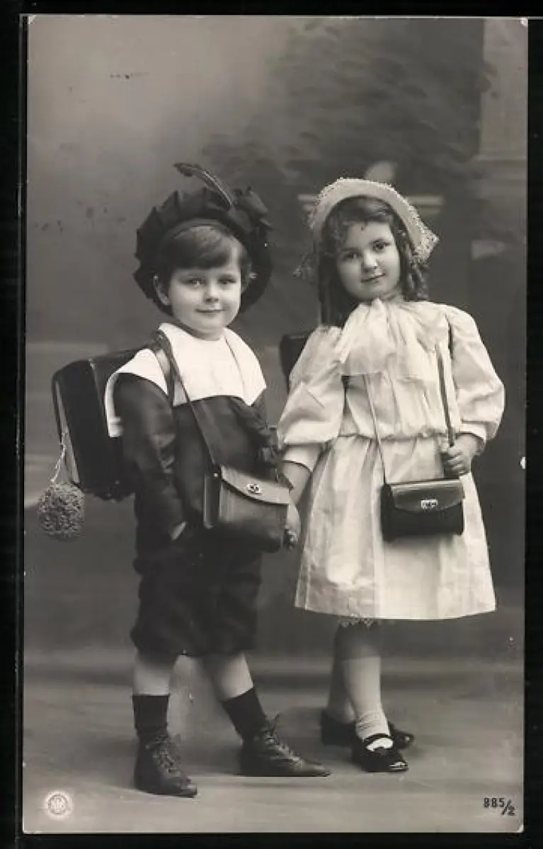 AK Zwei süsse Schulkinder gehen gemeinsam zur Schule