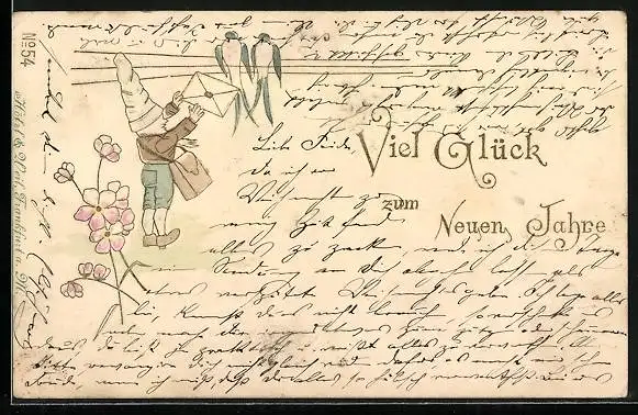 AK Zwerg bringt Schwalben einen Brief, Neujahrsgruss