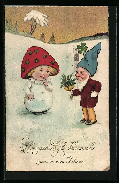 AK Zwerg reicht einem Pilzkind einen Stechpalmenstrauss, Neujahrsgruss
