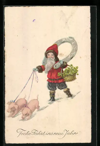 AK Zwerg trägt Hufeisen und führt Glücksferkel an der Leine, Neujahrsgruss