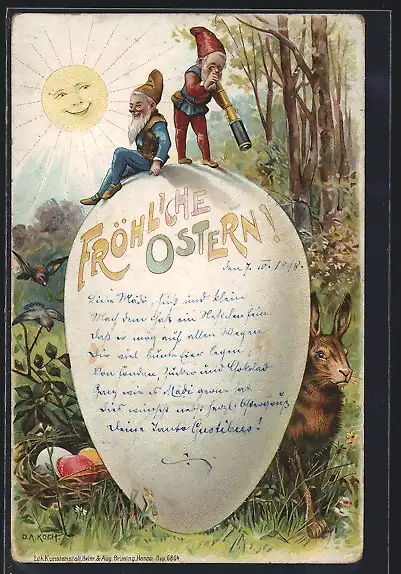 AK Zwerge auf einem übergrossen Osterei, Osterhase