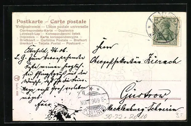 Personenbezogene Daten auf der Rückseite der Karte wurden durch blauen Textmarker unkenntlich gemacht. Die blauen Stellen sind auf die Vorderseite durchgeweicht und wirken sich negativ auf das Postkartenfoto aus