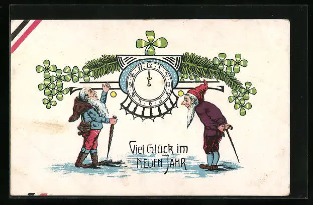 AK Zwerge neben einer Uhr zu Mitternacht, Neujahrsgruss