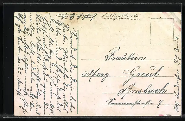 Personenbezogene Daten auf der Rückseite der Karte wurden durch blauen Textmarker unkenntlich gemacht. Die blauen Stellen sind auf die Vorderseite durchgeweicht und wirken sich negativ auf das Postkartenfoto aus