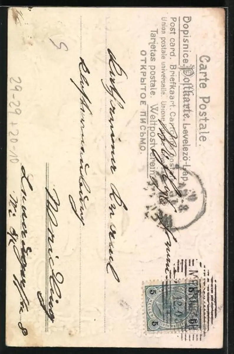 Personenbezogene Daten auf der Rückseite der Karte wurden durch blauen Textmarker unkenntlich gemacht. Die blauen Stellen sind auf die Vorderseite durchgeweicht und wirken sich negativ auf das Postkartenfoto aus