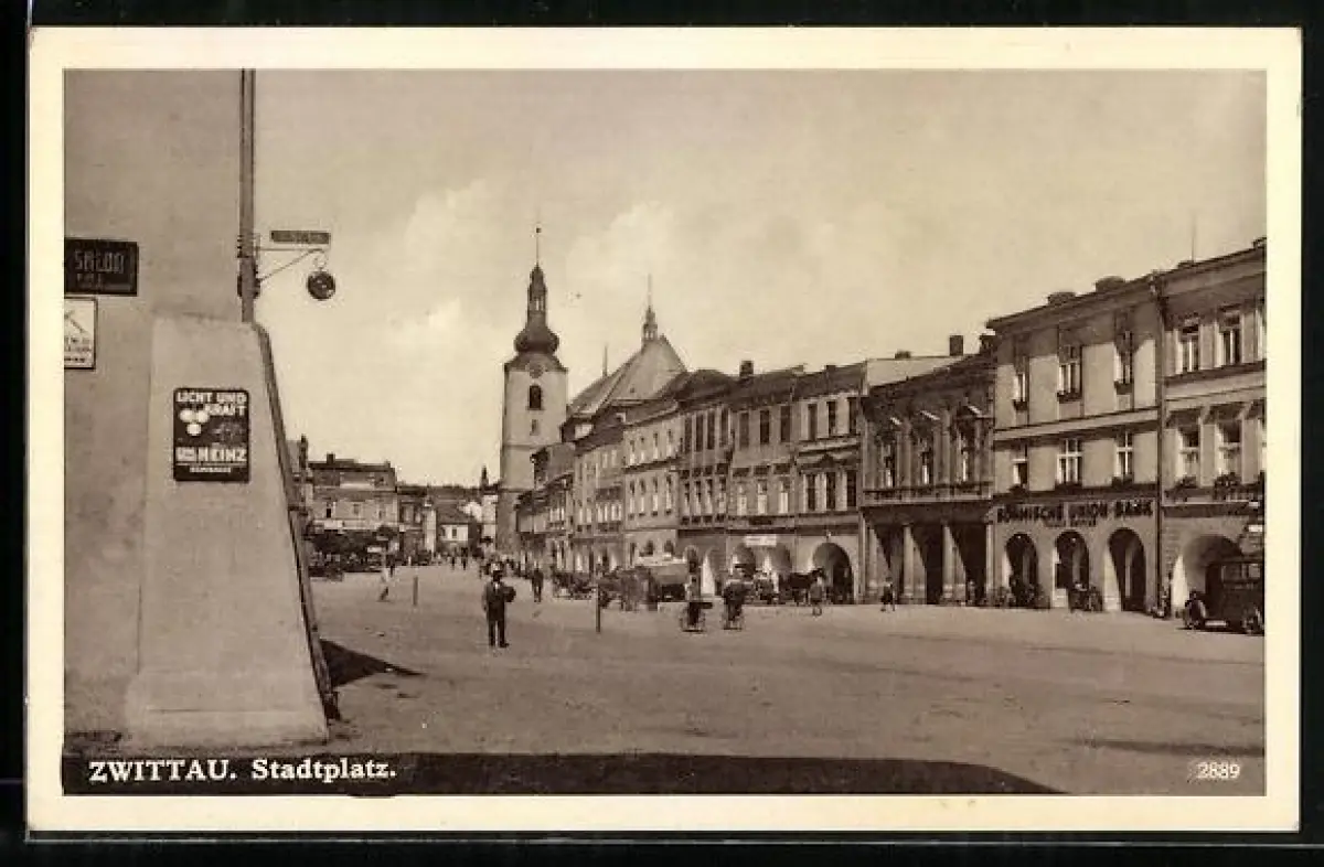 AK Zwittau, Stadtplatz mit Böhmische Union-Bank, Turm