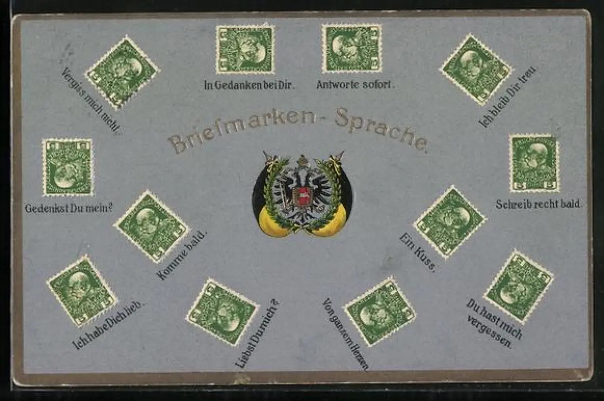 AK Zwölf verschiedene Möglichkeiten der Briefmarken-Sprache