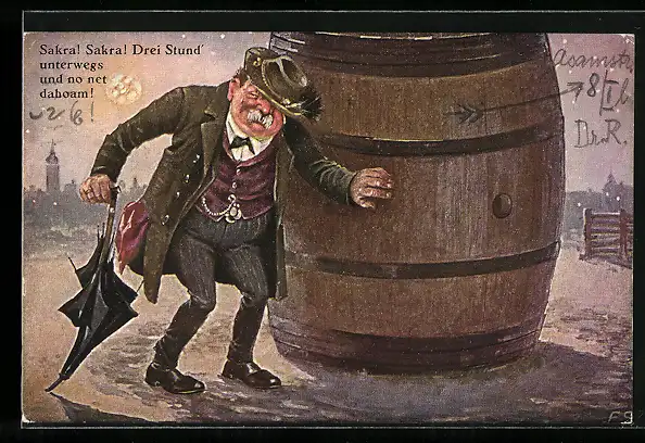 AK betrunkener Mann lehnt an ein Bierfass und wundert sich warum er noch nicht zu Hause ist