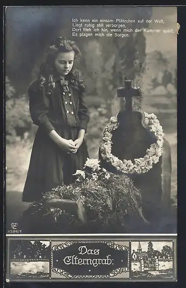 AK das Elterngrab, junge Frau blickt auf das Grab