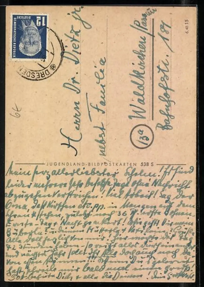 Personenbezogene Daten auf der Rückseite der Karte wurden durch blauen Textmarker unkenntlich gemacht. Die blauen Stellen sind auf die Vorderseite durchgeweicht und wirken sich negativ auf das Postkartenfoto aus