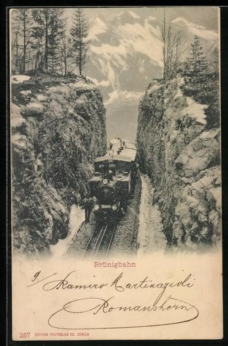 AK die Brünigbahn passiert die Passhöhe, Bergbahn
