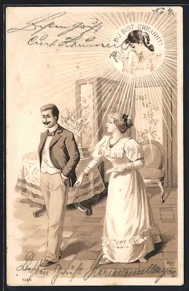 AK du bist erkannt!, Frau im Kleid bei ihrem Geliebten, Liebespaar