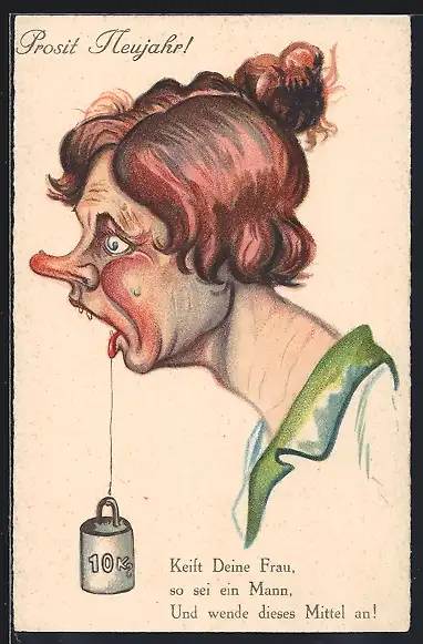 AK frauenfeindlicher Humor, Frau mit Gewicht am geöffneten Mund