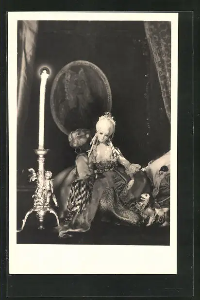 AK hübsche Puppe im barocken Kleid auf einem Puppenbett sitzend