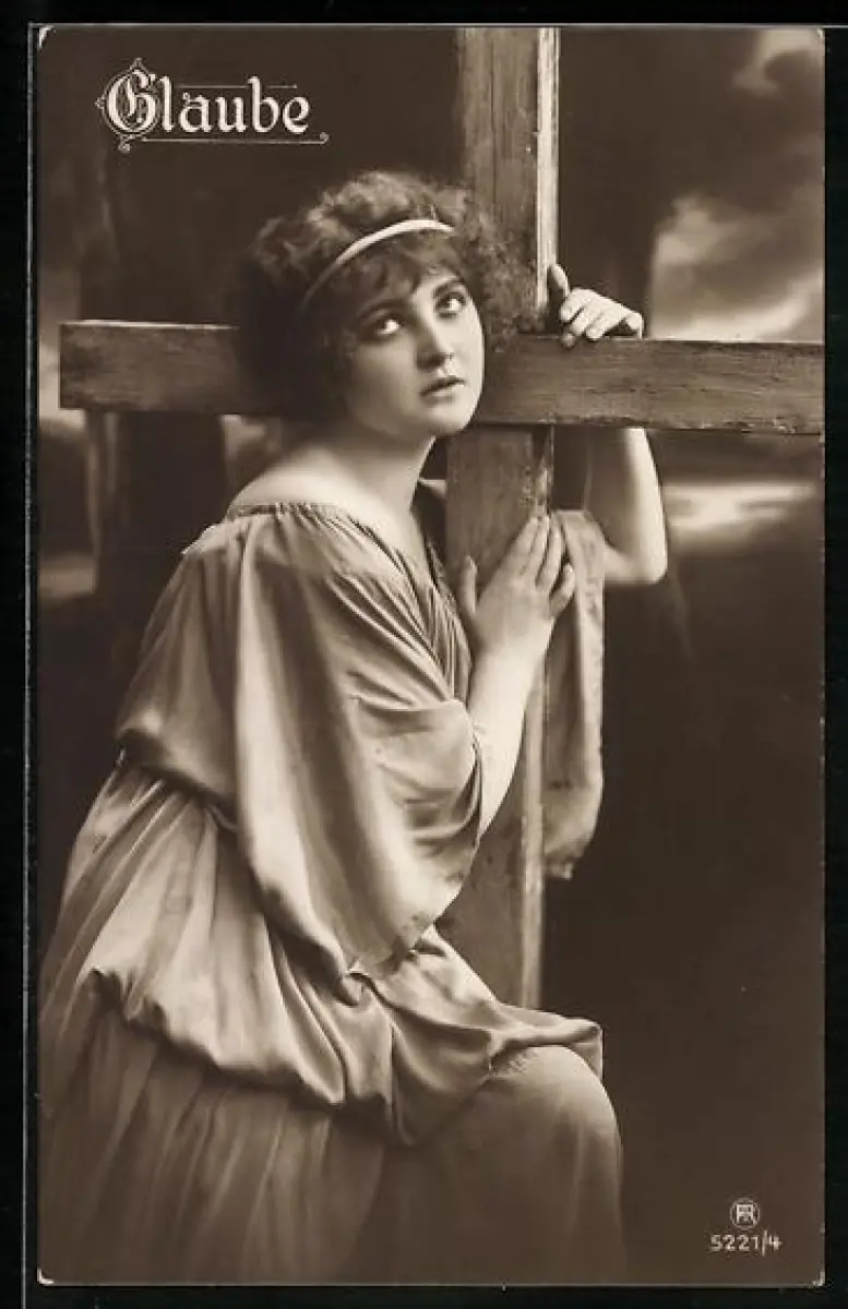 AK junge Frau lehnt sich an ein Kreuz, Glaube, Allegorie