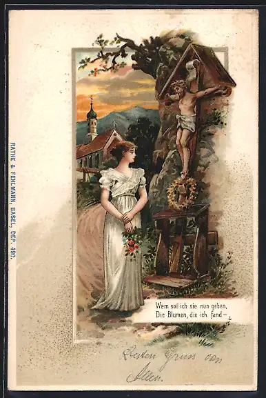 AK junge Frau mit Blumen in der Hand vor Jesuskreuz