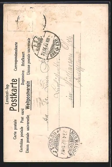alte Ansichtskarte, gelaufen 1902, Briefmarke entfernt, rückseitig Oberflächenschaden, guter Zustand