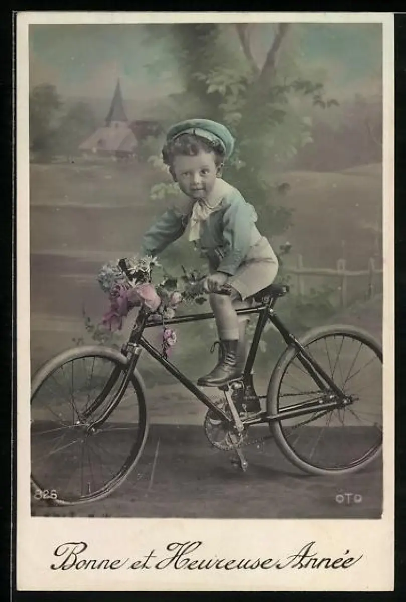 AK kleiner Junge auf Blumen-geschmücktem Fahrrad