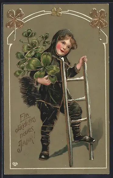 AK kleiner Schornsteinfeger mit Leiter und Kleeblättern, Neujahr