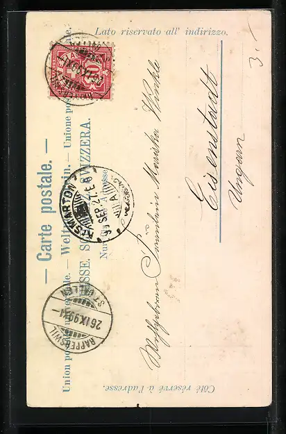 Personenbezogene Daten auf der Rückseite der Karte wurden durch blauen Textmarker unkenntlich gemacht. Die blauen Stellen sind auf die Vorderseite durchgeweicht und wirken sich negativ auf das Postkartenfoto aus