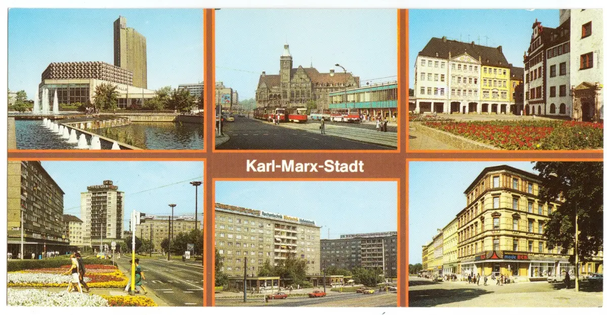 sechs Abb. - Stadthalle und Interhotel, Rathaus, Siegert'sches Haus, Ernst-Thälmann-Str., Wilhelm-Pieck-Str., Straßenkreuzung
