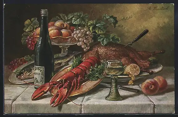 AK reich gedeckter Tisch mit Hummer und Gänsebraten