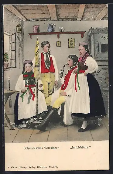 AK schwäbische Volkstrachten, Im Lichtkarz, zwei Paare in Trachten, Pfeife rauchender Mann