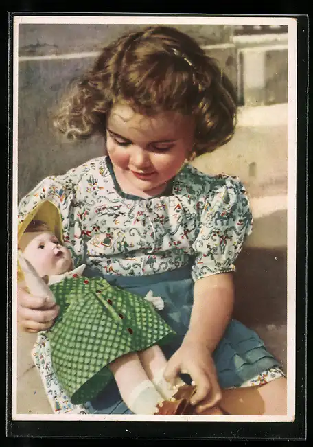 AK süsses Mädchen spielt mit ihrer Puppe, Puppe im grünen Kleid