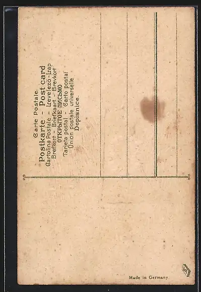 Personenbezogene Daten auf der Rückseite der Karte wurden durch blauen Textmarker unkenntlich gemacht. Die blauen Stellen sind auf die Vorderseite durchgeweicht und wirken sich negativ auf das Postkartenfoto aus