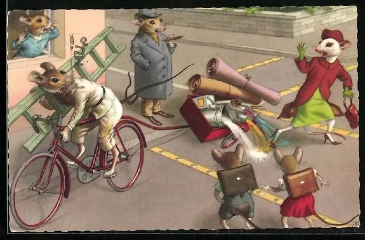AK vermenschlichte Tiere, Mäuse an einem hektischen Tag in einer Strasse