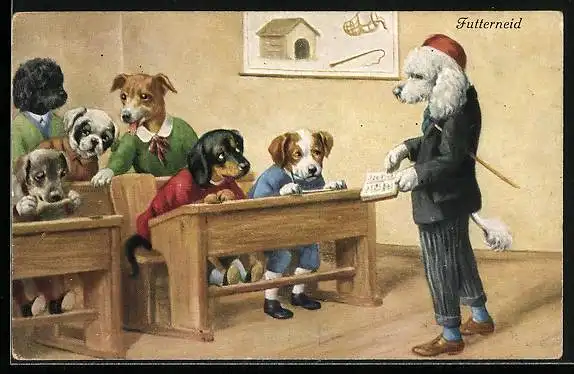 AK vermenschlichter Pudel unterrichtet als Lehrer Hundekinder in der Schule