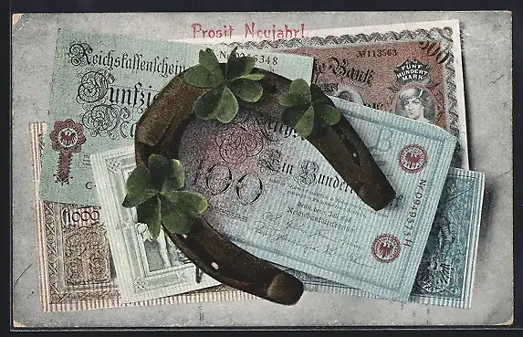 AK verschiedene Reichskassenscheine und Banknoten unter einem Hufeisen, Neujahrsgruss