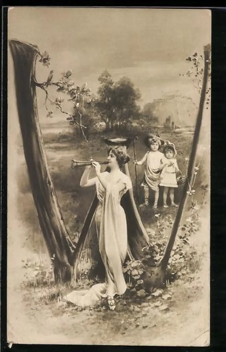 AK zum Buchstaben W geformte Bäume, Frau steht davor, Kinder dahinter