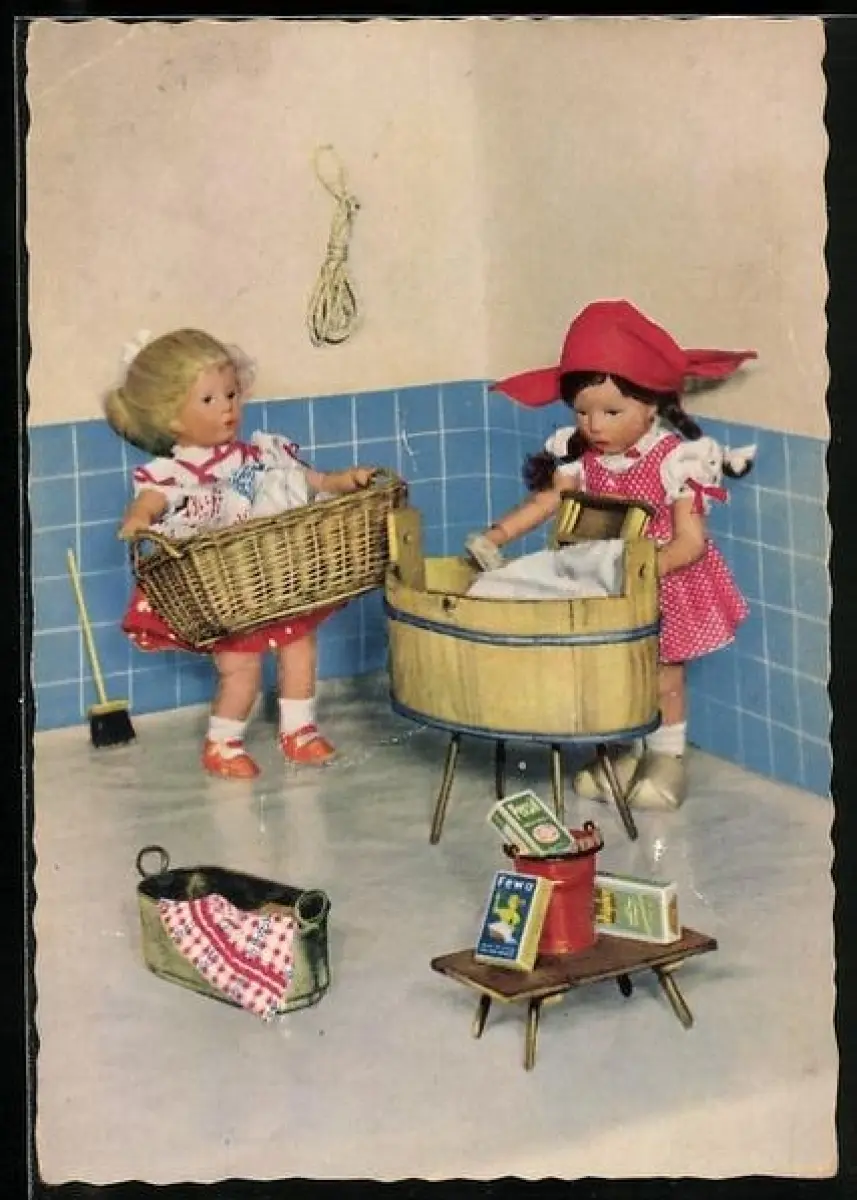 AK zwei Puppen mit Wäschekörben, Waschmittel