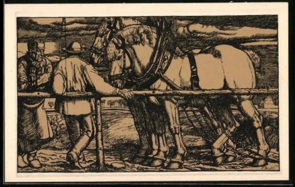AK zwei grosse Pferde im Geschirr mit Männern an Zaun