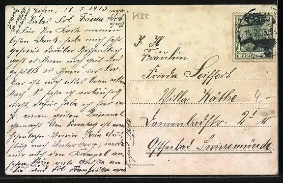 alte Ansichtskarte, gelaufen 1913, Stempelspur, Abriebspur li. oben, guter Zustand
