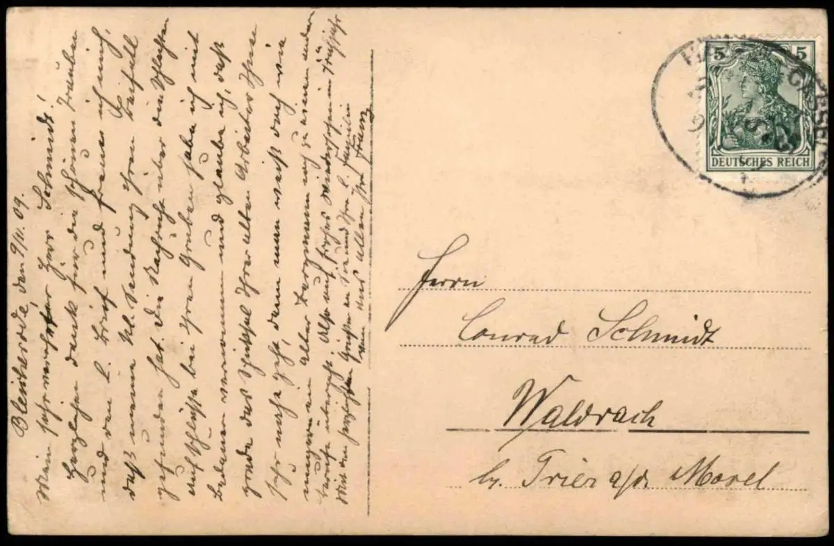 Gelaufen: 09.08.1909 mit Bahnpoststempel nach Waldrach bei Trier