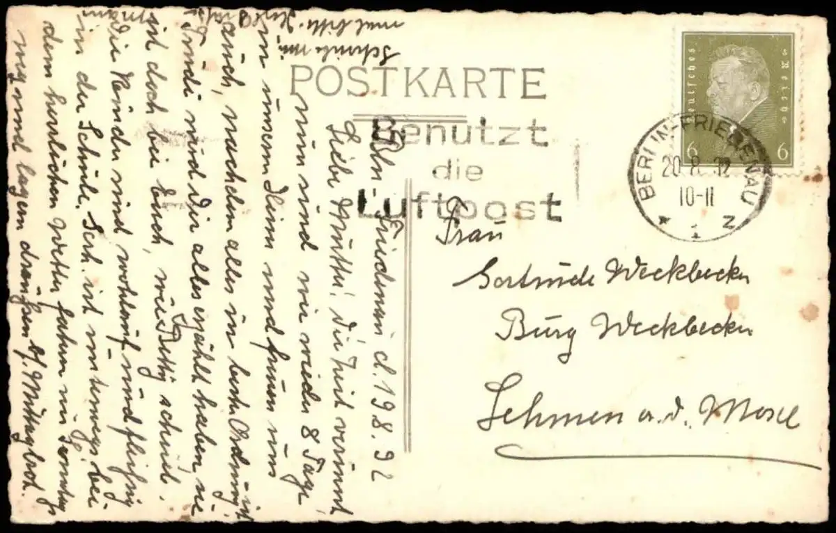 Gelaufen: 20.08.1932 mit Stempel Berlin Friedenau an Gertrude Weckbecker auf Burg Weckbecker Lehmen (Liebe Mutter..)Erhaltung (s. Scan): gut / 916224