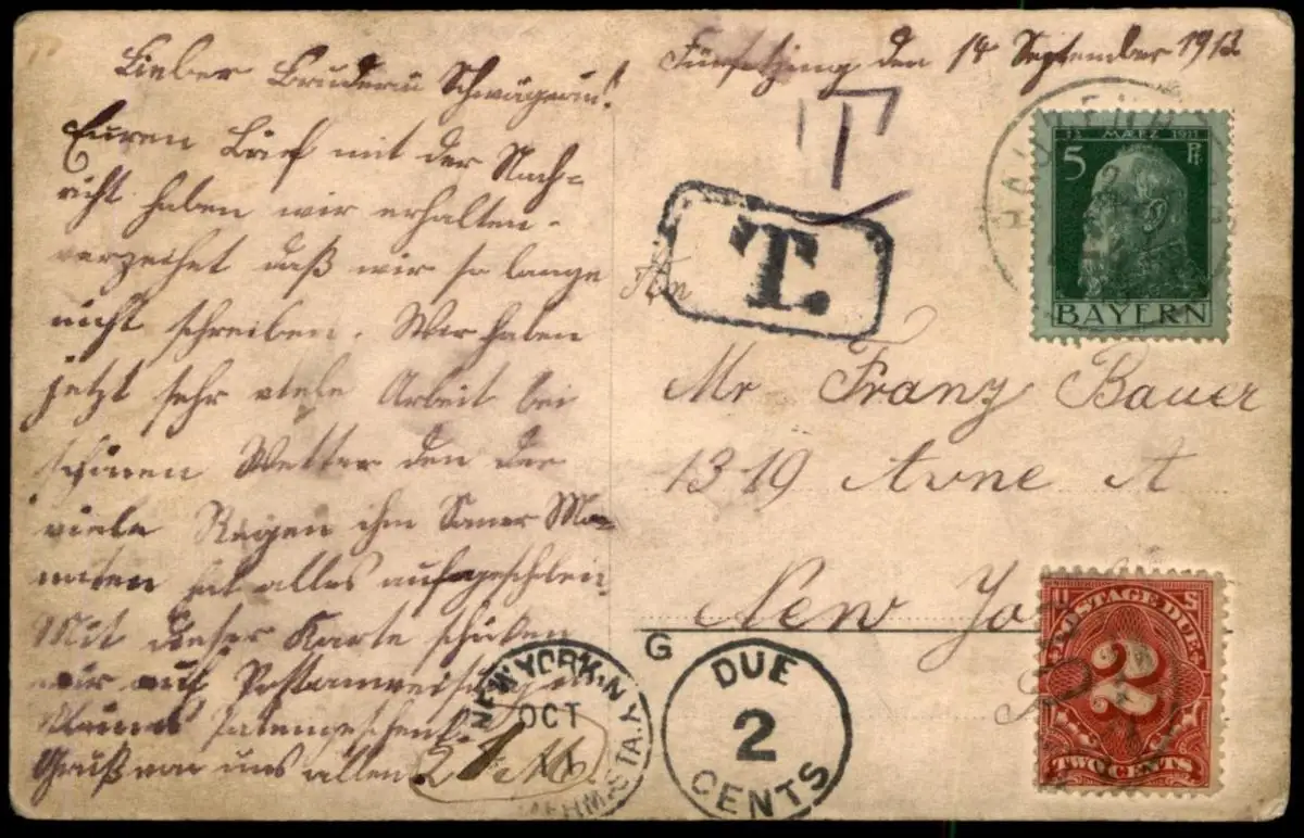Gelaufen: 14.09.1913 mit Stempel Hauzenberg nach New York an Franz BauerErhaltung (s. Scan): gut / 918309