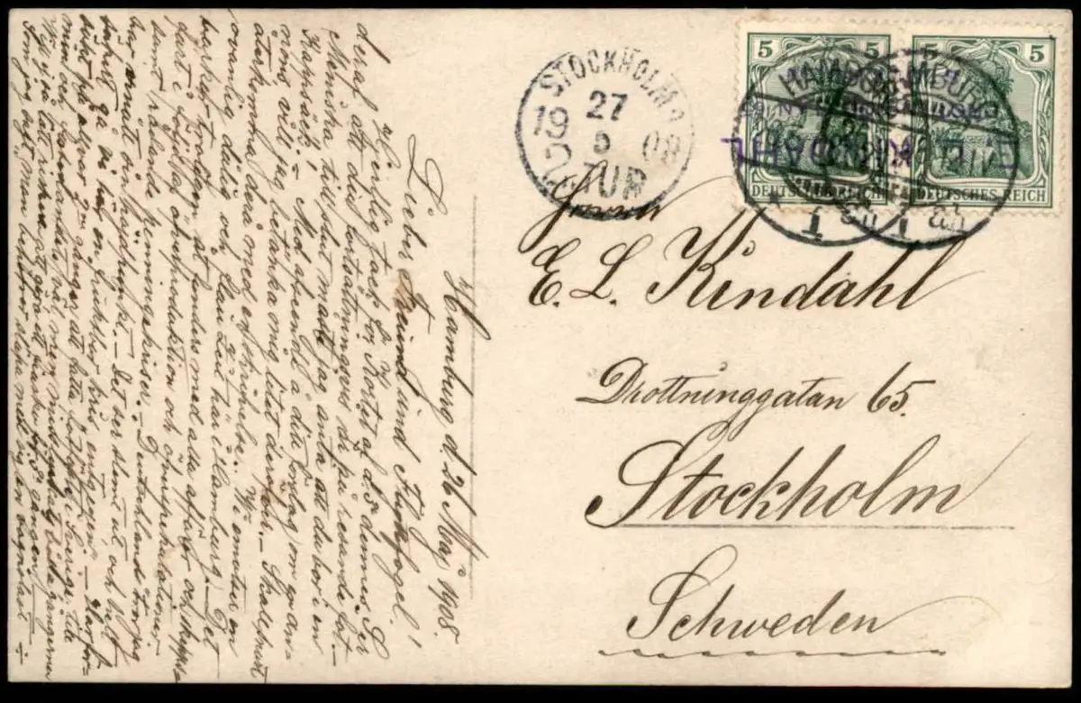 Gelaufen: 26.05.1908 mit Stempel Hamburg nach Stockholm an E. L. Kindahl, Verfasser Nordblom