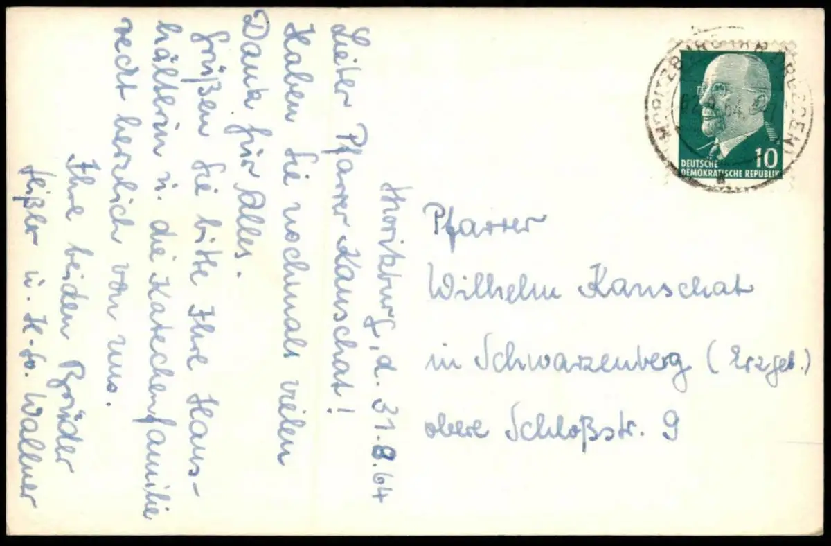 Gelaufen: 02.08.1964 mit Stempel Moritzburg Dresden nach SchwarzenbergErhaltung (s. Scan): gut, linksseitig mittig minimal bestoßen / 917348
