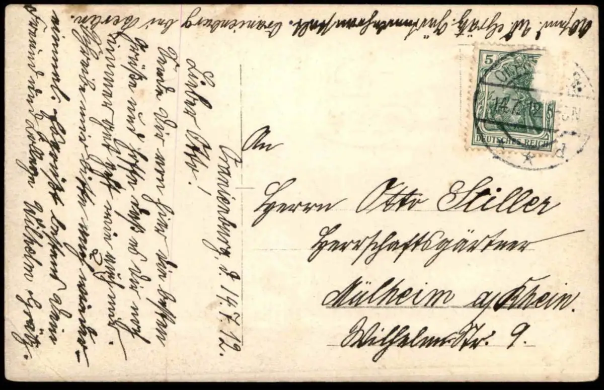 Gelaufen: 14.07.1912 mit Stempel Oranienburg nach Mülheim am Rhein an einen Gärtner Stiller, ein minimaler Teil der Briefmarke (sauber) entfernt