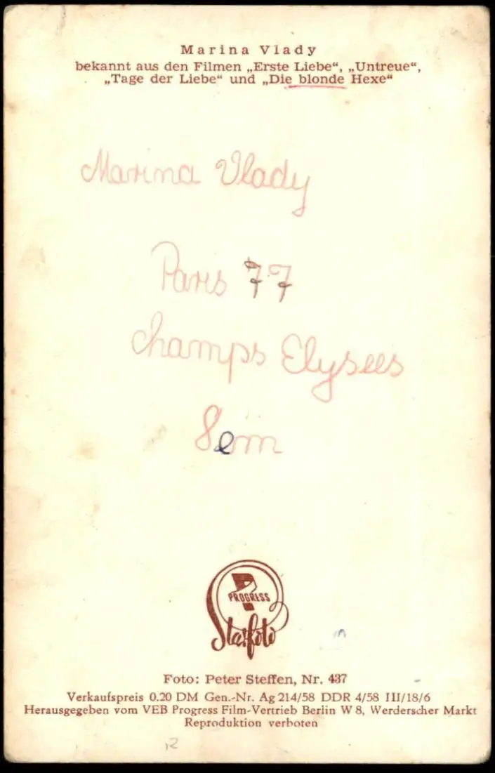 ALTE KARTE MARINA VLADY FILM-SCHAUSPIELERIN STARFOTO VEB PROGRESS BERLIN DDR actress postcard Ansichtskarte AK cpa