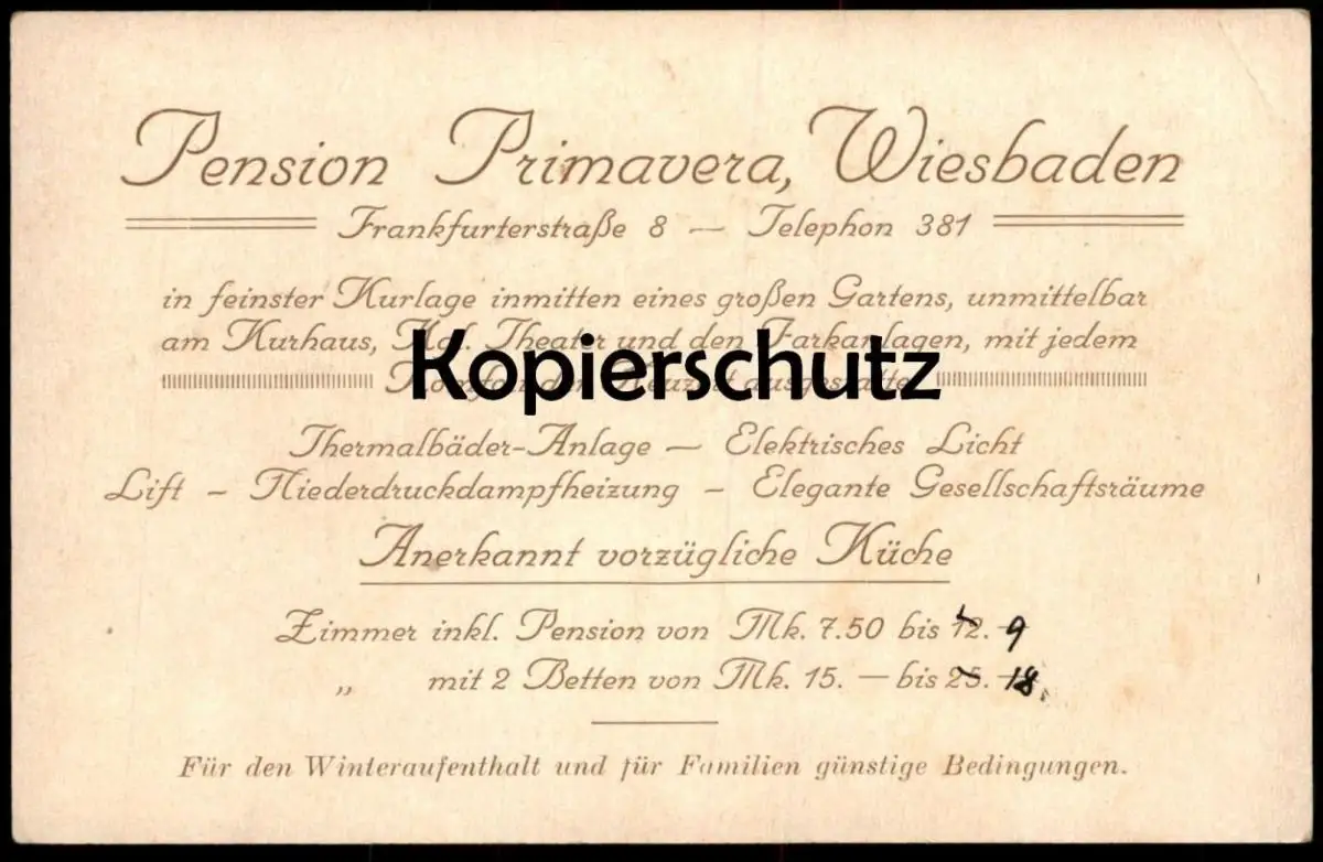 ALTE KARTE VILLA PRIMAVERA PENSION WIESBADEN In feinster Kurlage inmitten eines großen Gartens, ..., mit jedem Komfort der Neuzeit ausgestattet Elektrisches Licht Niederdruckdampfheizung