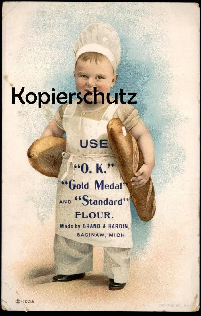 ALTE KARTE SAGINAW MICHIGAN USE O.K. GOLD MEDAL AND STANDARD FLOUR BRAND & HARDIN boy bread postcard Ansichtskarte