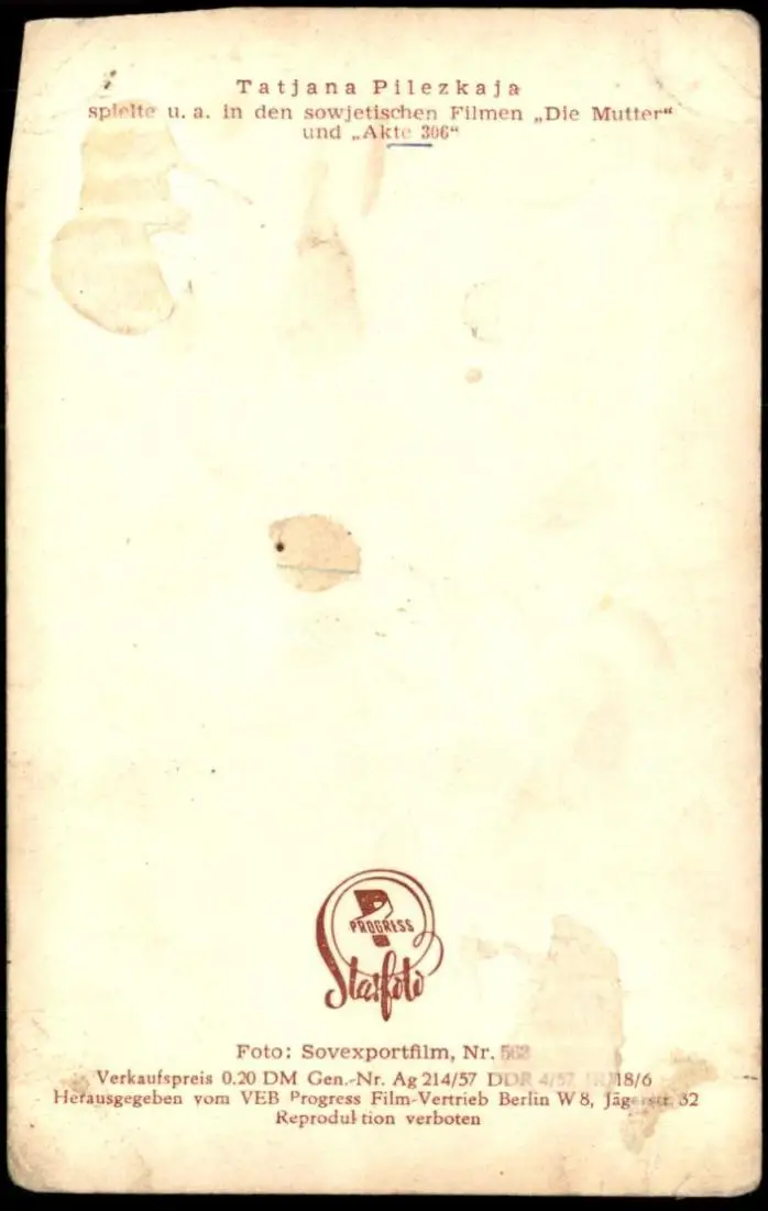 ALTE KARTE TATJANA PILEZKAJA FILM-SCHAUSPIELERIN SAHEN SIE IN DEN SOWJETISCHEN FILMEN DIE MUTTER / AKTE 306Verlag: Starfoto VEB Progress, Berlin, Foto: Sovexportfilm